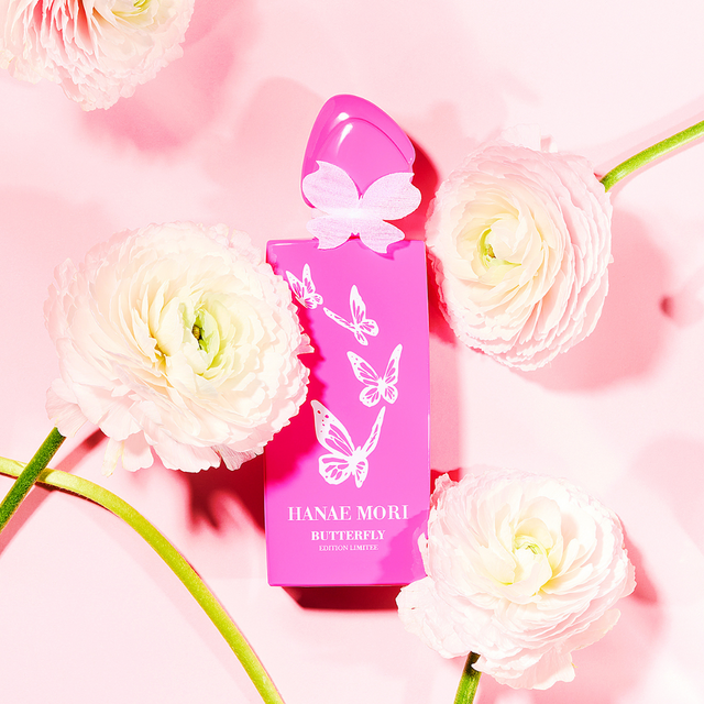 The intense rose lacquered collector's bottle is adorned with a flight of white butterflies. A white chiffon butterfly graces the cap of the lacquered glass bottle. This whimsical jewel can be wrapped around your finger or hair, serving as a link of attachment to your fragrance. Presented in its candy pink case, this marvel unveils itself by delicately untying the white cord.