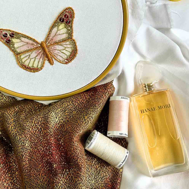 As someone who works in Haute Couture, it felt like a wonderful tribute. A thread connecting me to the designer, who is no longer with us, and to my own creative universe. It’s an honor to create this festive butterfly, this embroidered jewel by Agathe YOU in homage to Hanae Mori and her extraordinary career. Seeing my creation alongside her iconic Butterfly perfume brings me so much joy! It’s like a resurgence of my childhood happiness with my embroidered butterfly.